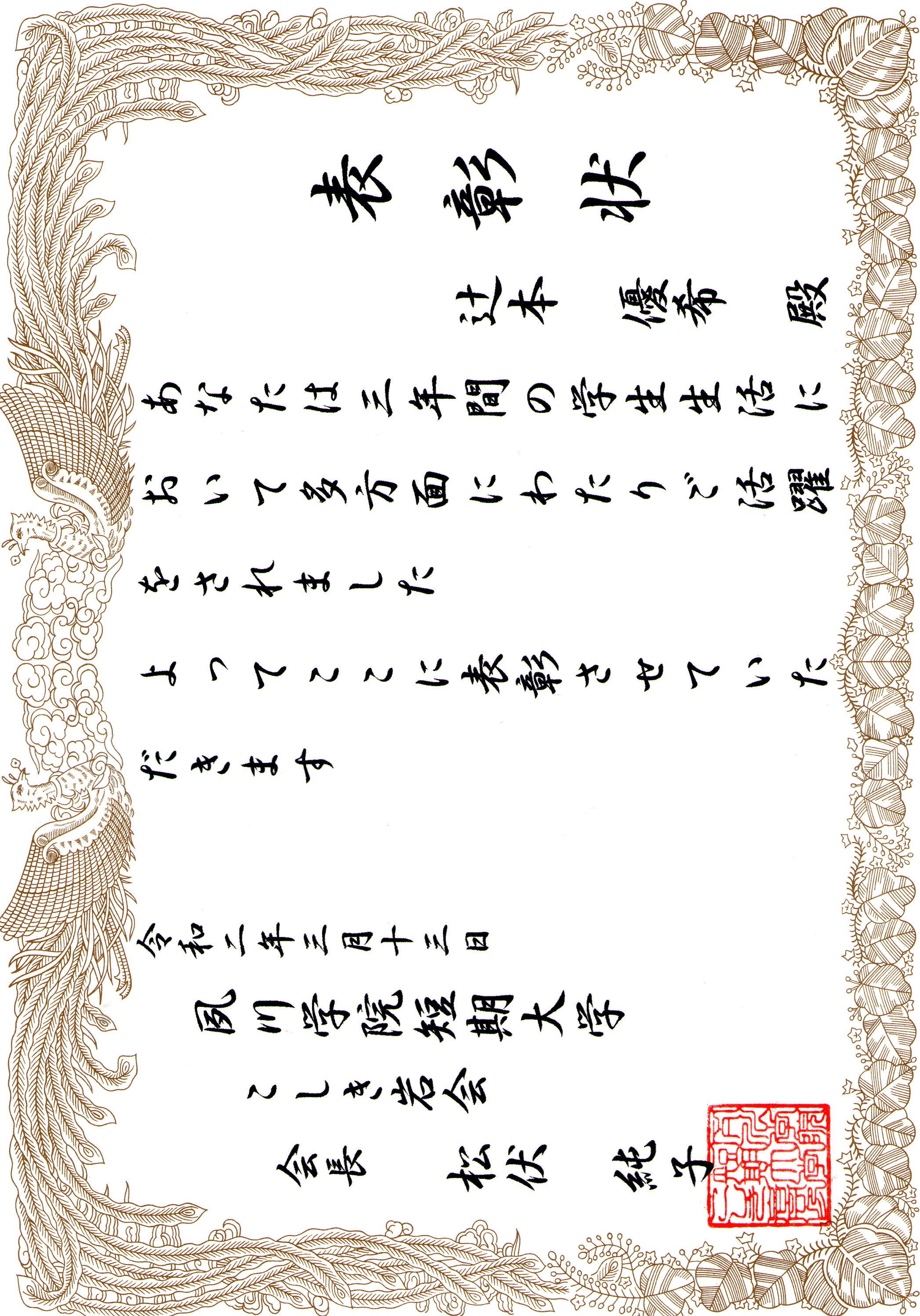 しかしながら、三年間学業に専念され頑張られた辻本さんですので、これから社会へ出られても大いに活躍されることと大変期待しています。