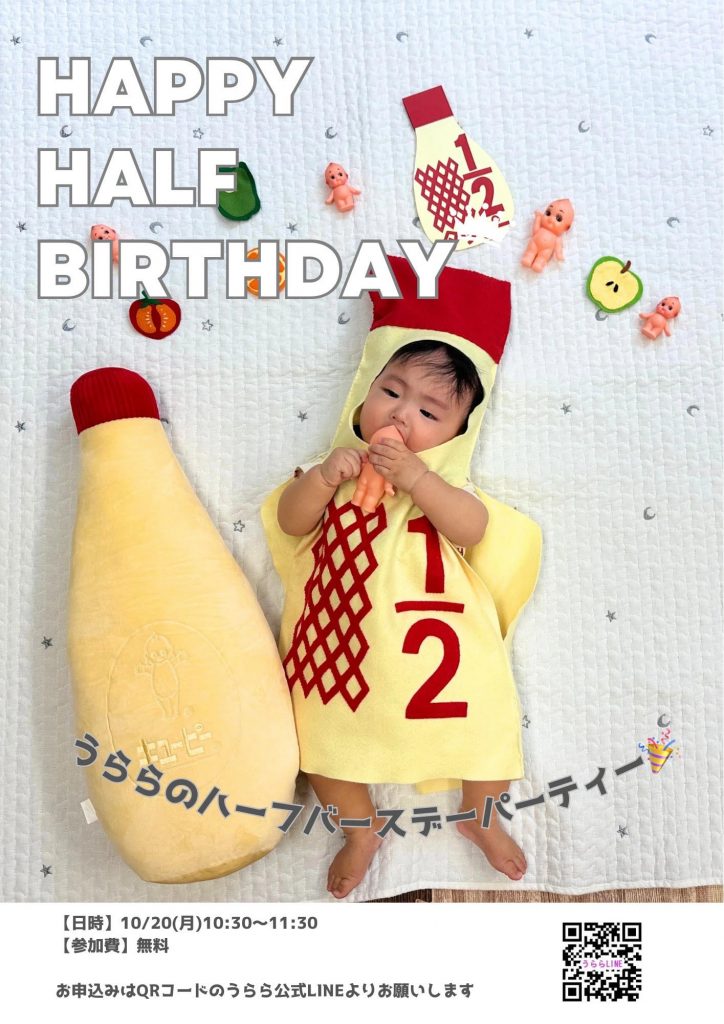 【子育てイベント】ハーフバースデー🎂 Posted on 2025年10月3日 by 地域子育て支援拠点事業 TOPうららKOBE【子育てイベント】ハーフバースデー🎂 ハーフバースデーを迎えるお友達、あつまれ~!!みんなでお祝いしませんか?衣装を着て記念撮影や記念の足形カード作りなどなど…。同じ月齢の子どもやその保護者の方と交流のチャンスも♪