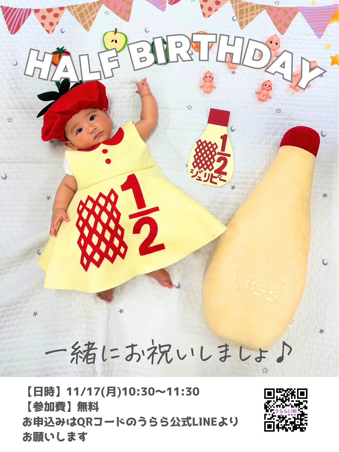 【子育てイベント】ハーフバースデー🎂 Posted on 2025年10月24日2025年10月24日 by 地域子育て支援拠点事業 TOPうららKOBE【子育てイベント】ハーフバースデー🎂 ハーフバースデーを迎えるお友達、あつまれ~!!みんなでお祝いしませんか?衣装を着て記念撮影や記念の足形カード作りなどなど…。同じ月齢の子どもやその保護者の方と交流のチャンスも♪