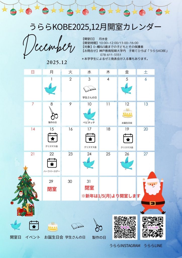 子育てひろば「うららKOBE」12月開室について Posted on 2025年11月21日 by 地域子育て支援拠点事業 TOPうららKOBE子育てひろば「うららKOBE」12月開室について 12月もイベントを沢山企画しています♪ぜひ遊びに来てくださいね!※うららの年内最終日は12/26(金)です。年始は1/5(月)からとなります。
