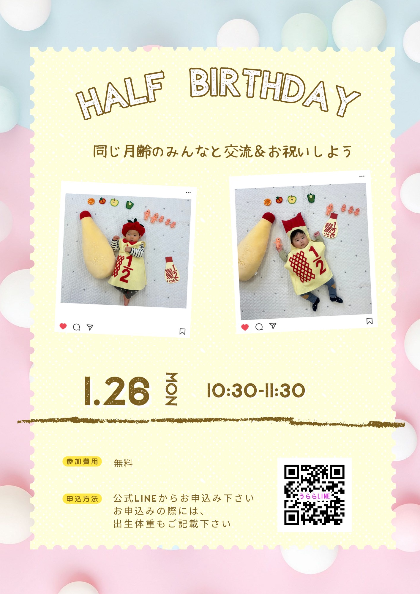 【子育てイベント】1月ハーフバースデー🎂 Posted on 2026年1月5日2026年1月5日 by 地域子育て支援拠点事業 TOPうららKOBE【子育てイベント】1月ハーフバースデー🎂 ハーフバースデーのお友達集まれ~!!可愛い衣装で撮影したり、記念のカードを作ったり…。生後半年をみんなでお祝いしませんか?同じ月齢の子どもを持つ保護者さん同士の交流も♪