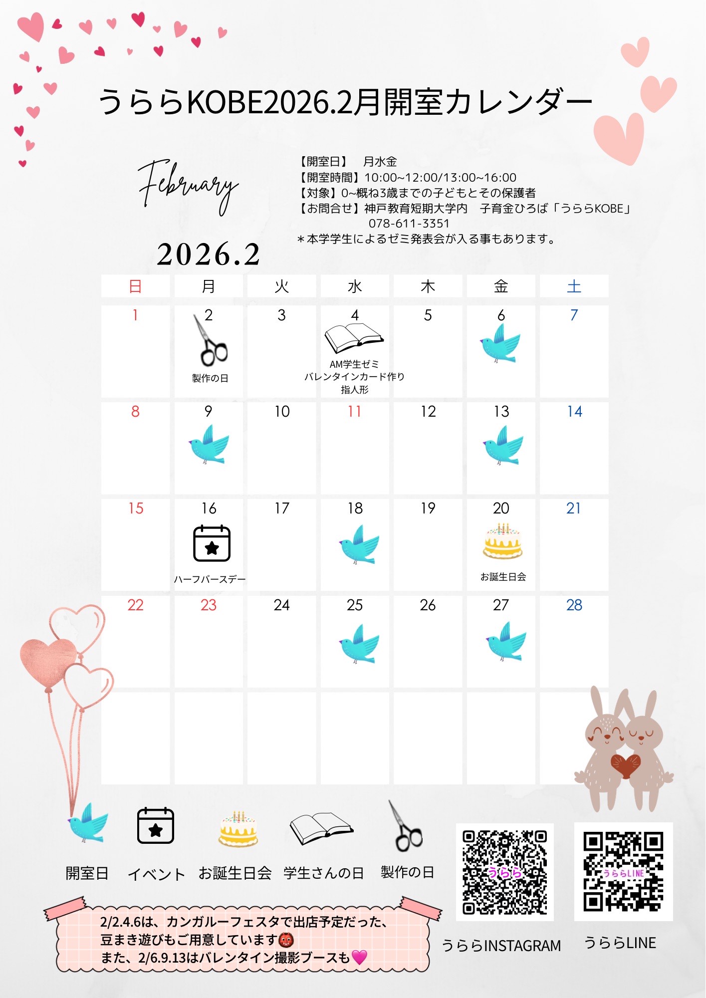 子育てひろば「うららKOBE」2月開室について Posted on 2026年2月9日 by 地域子育て支援拠点事業 TOPうららKOBE子育てひろば「うららKOBE」2月開室について まだまだ寒い日が続きますが、ぜひ遊びに来てくださいね!!