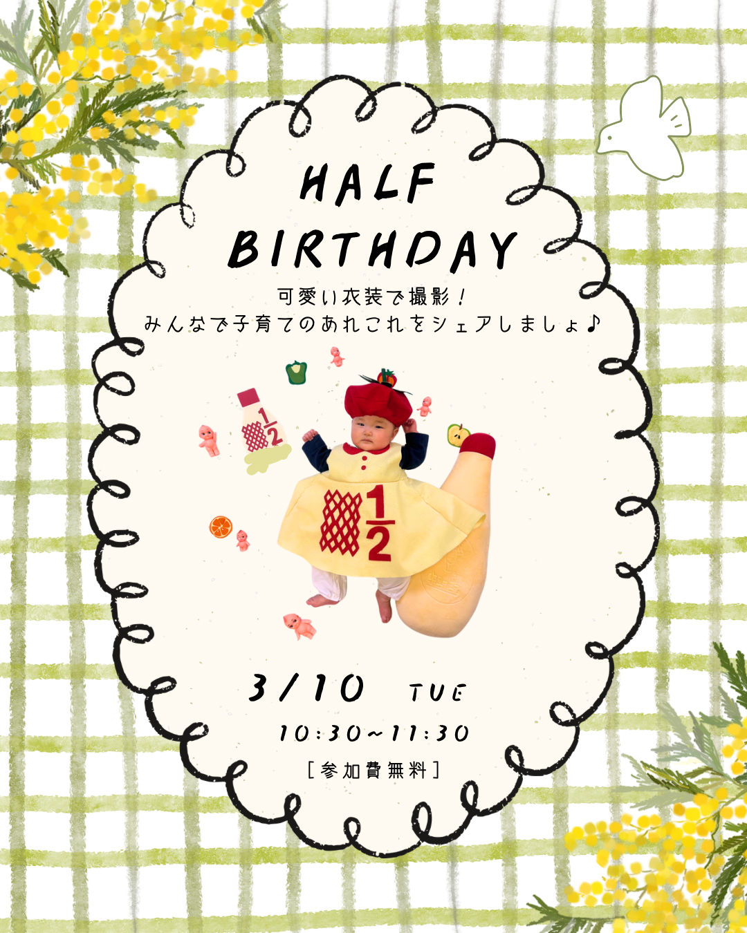 【子育てイベント】3月ハーフバースデー🎂 Posted on 2026年3月3日 by 地域子育て支援拠点事業 TOPうららKOBE【子育てイベント】3月ハーフバースデー🎂 みんなでハーフバースデーのお祝いしませんか?可愛い衣装を着て記念撮影をしたり、同じ月齢の悩みを共有したり♪楽しい時間を過ごしましょう!ご予約はうらら公式LINEまで。
