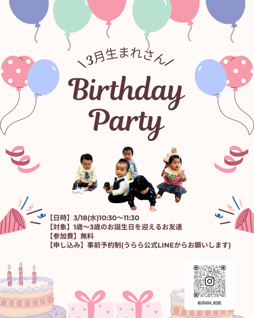 【子育てイベント】3月お誕生日会🎉 Posted on 2026年3月3日 by 地域子育て支援拠点事業 TOPうららKOBE【子育てイベント】3月お誕生日会🎉 3月生まれさん集まれ~!!みんなでお歌を歌って、撮影して、記念のバッグを作って…。思い出に残るお誕生日にしましょう♪(参加対象は3歳になるお友達までです)