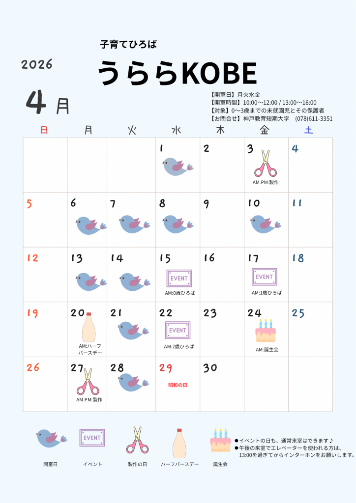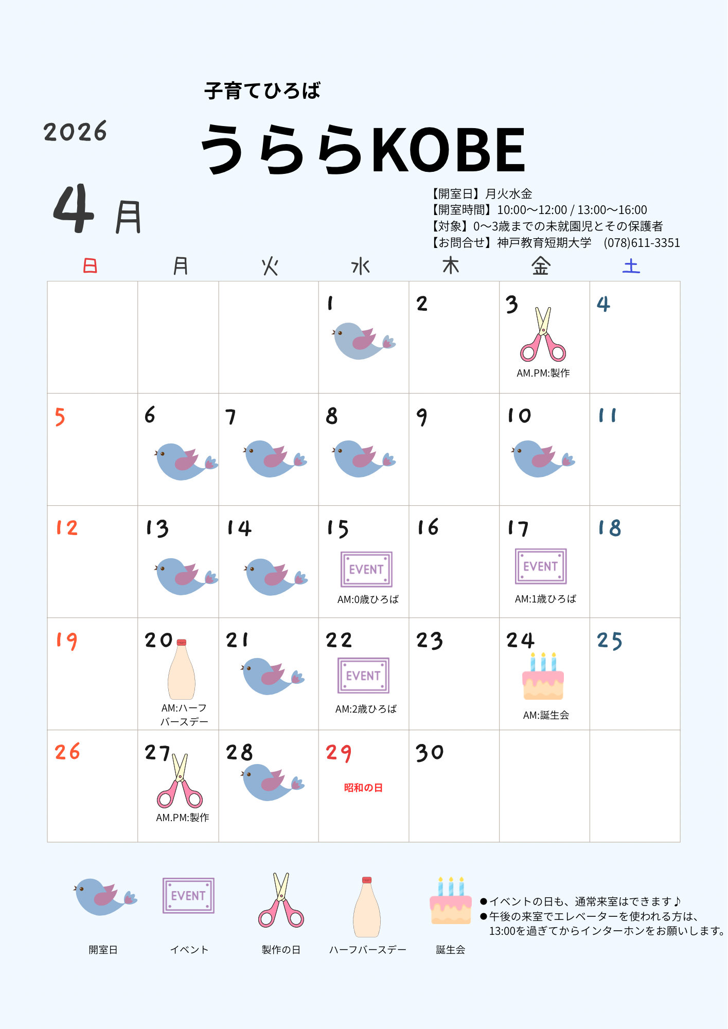子育てひろば「うららKOBE」4月開室について Posted on 2026年4月7日 by 地域子育て支援拠点事業 TOPうららKOBE子育てひろば「うららKOBE」4月開室について 日中はコートもいらず、気持ちの良い季節になってきましたね!うららでも春の製作やイベントを企画しています。 ぜひ遊びに来てくださいね!