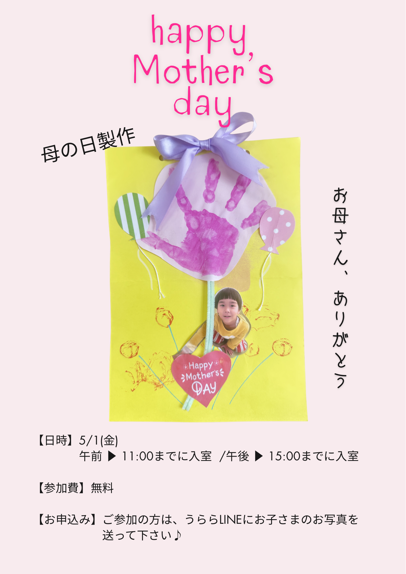 【子育てイベント】母の日製作 Posted on 2026年4月27日 by 地域子育て支援拠点事業 TOPうららKOBE【子育てイベント】母の日製作 5月の第2日曜は母の日♪大好きなママに、おばあちゃんにカードを作りませんか?