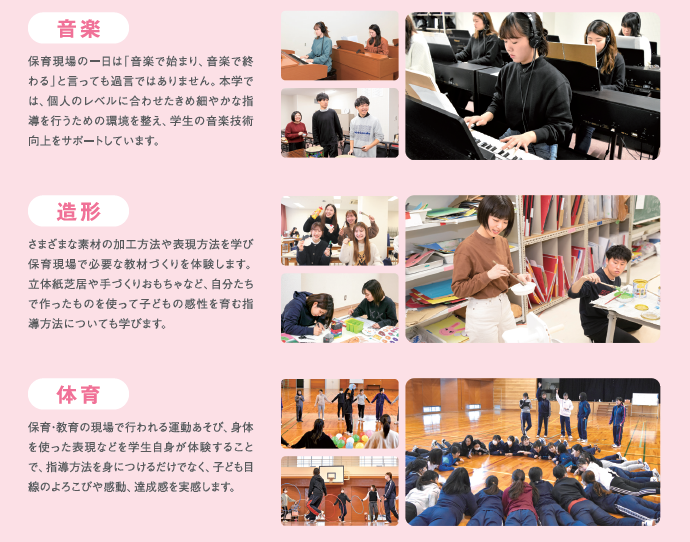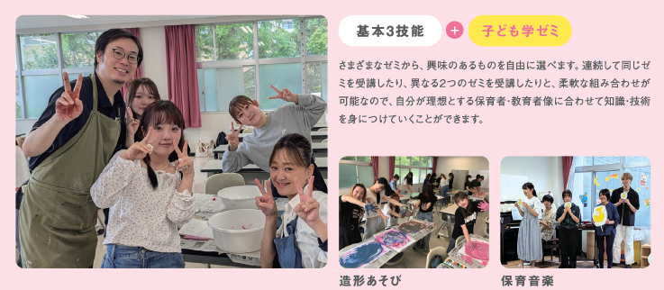 保育現場の必須技能である、音楽・造形・体育の基本3技能を学びます。これらの学びに加えて、これからの社会に求められるICT保育や保育英語についても学習します。さらに一人ひとりの得意分野を伸ばすことができる子ども学ゼミの学びが用意されています。