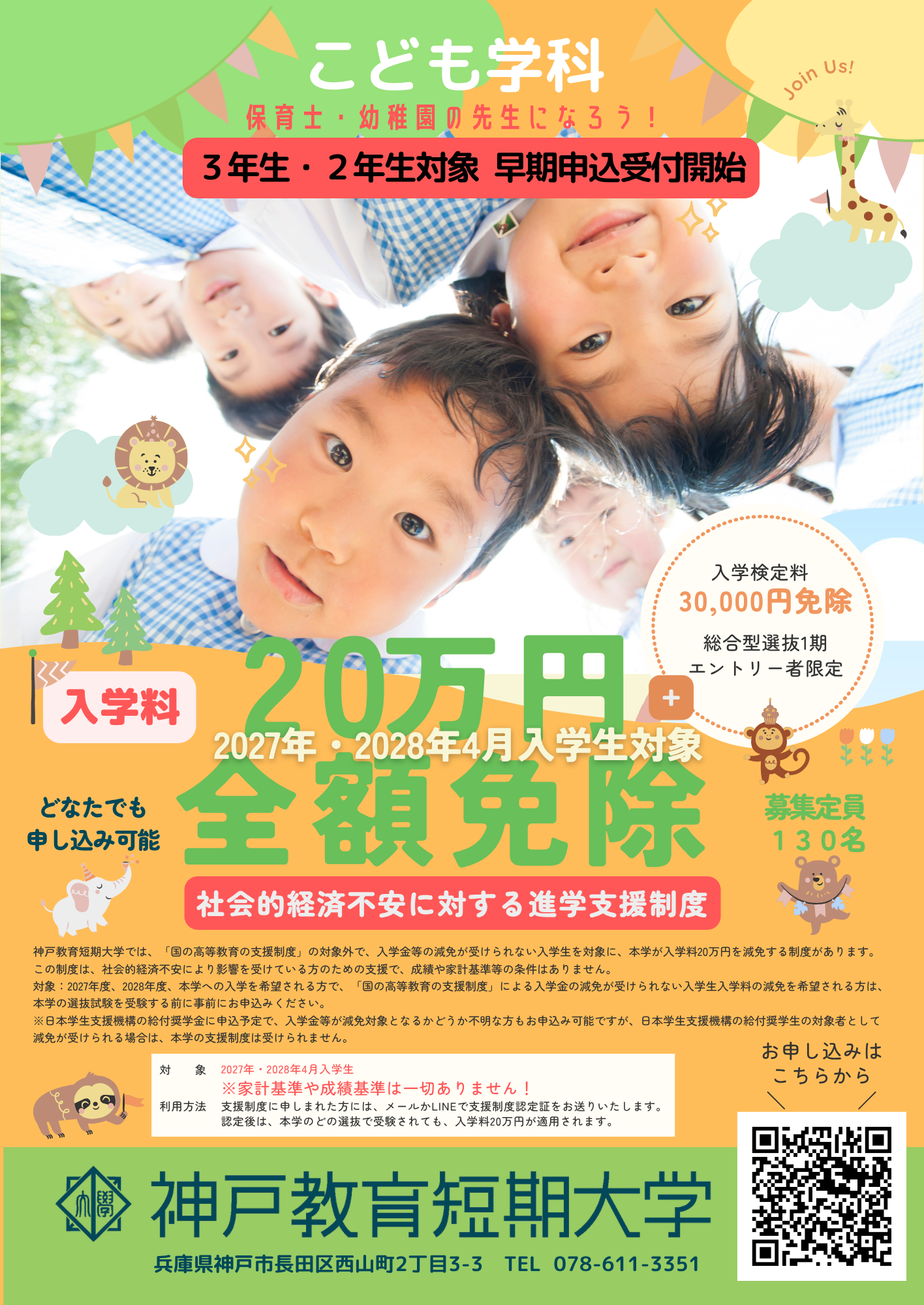 神戸教育短期大学では、「国の高等教育の支援制度」の対象外で、入学金等の減免が受けられない入学生を対象に、本学が入学料20万円を免除する制度があります。